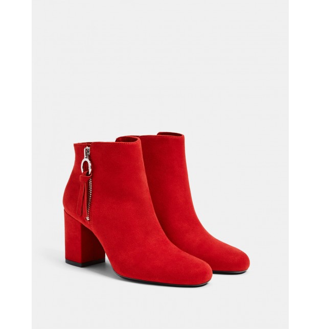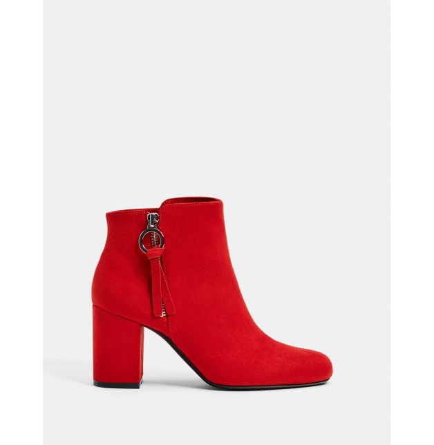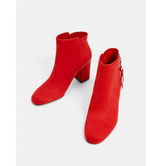 kırmızı, geniş topuklu bilekte bot. Fermuar kapamalı.