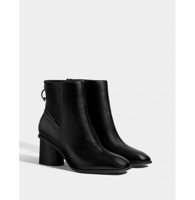 Siyah bilekte bot. Arkası fermuar kapamalı. Büyük halka şeklinde fermuar kayışlı