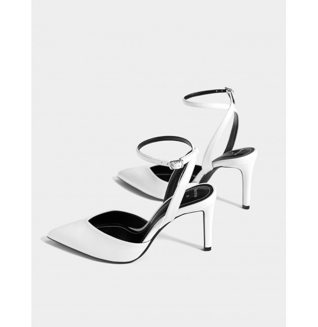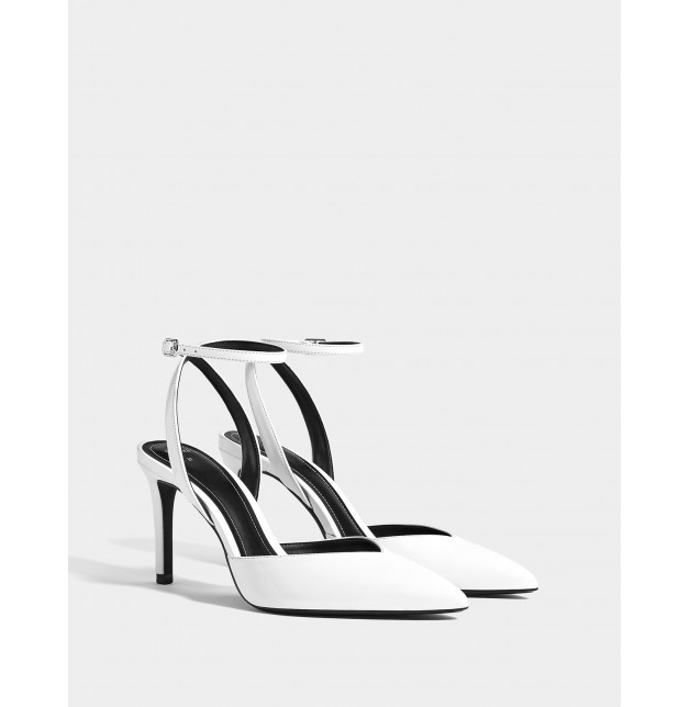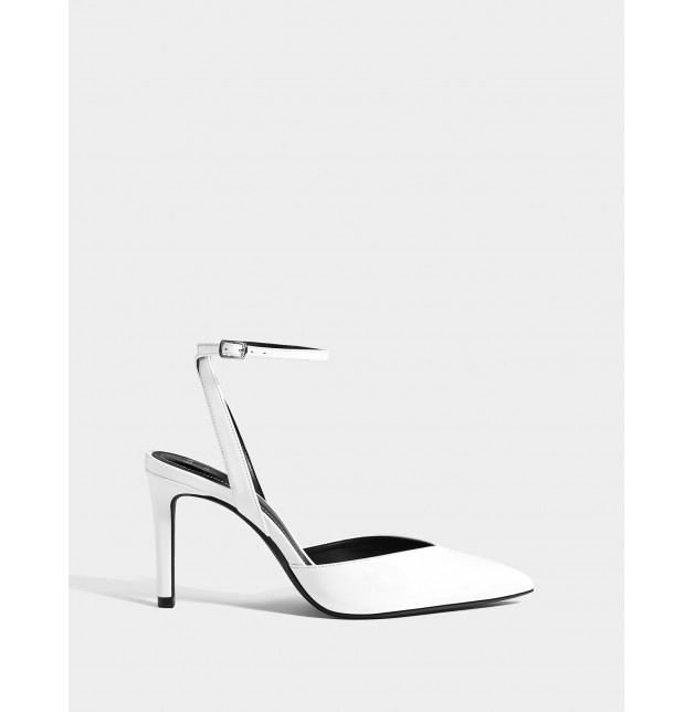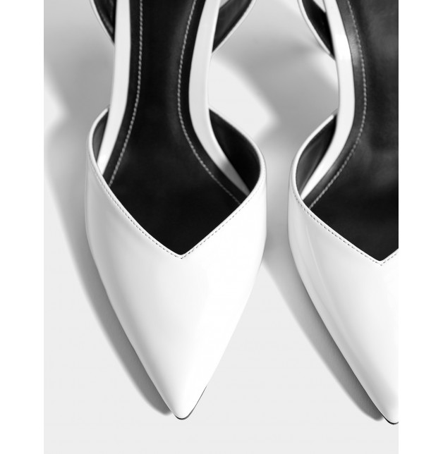 Topuk yüksekliği: 8,5 cm. Beyaz renkte ince topuklu ayakkabı. Rugan üst kısım. Sivri burun ve V şekilli üst kısım. Tokalı bantlı kapama.