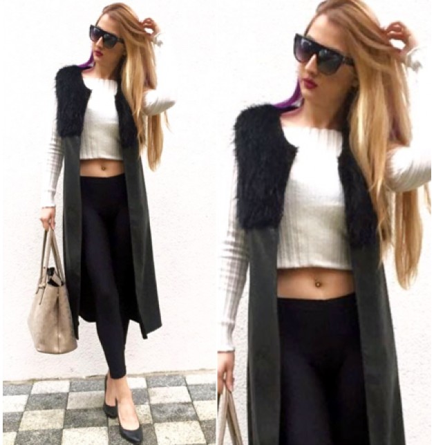 Japon Style Kürk Detaylı Uzun Deri Yelek | Moda